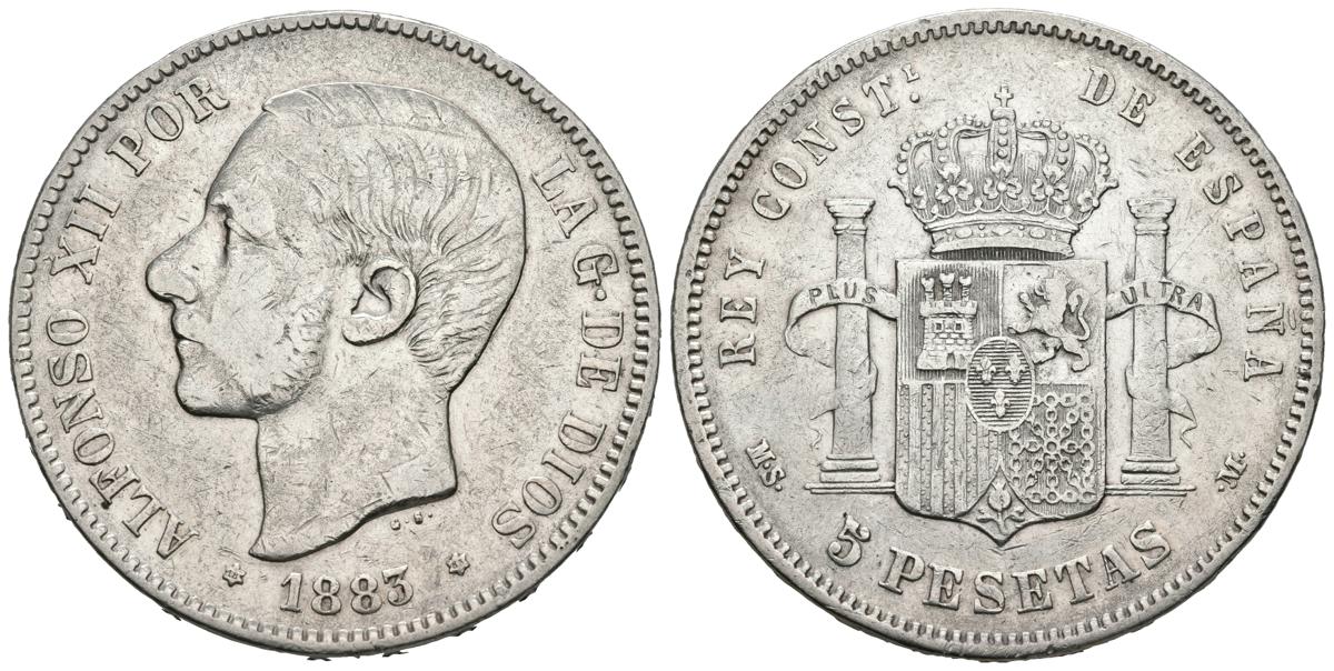 English ALFONSO XII (1874-1885). 5 Pesetas. (Ar. 24.75g / 37mm). 1883 * 18-83. Madrid MSM. (Cal-2019-55). F.