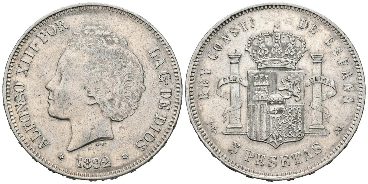 English ALFONSO XIII (1885-1931). 5 Pesetas. (Ar. 24.88g / 37mm). 1892 * 18-92. Madrid PGM. (Cal-2019-100). VF.