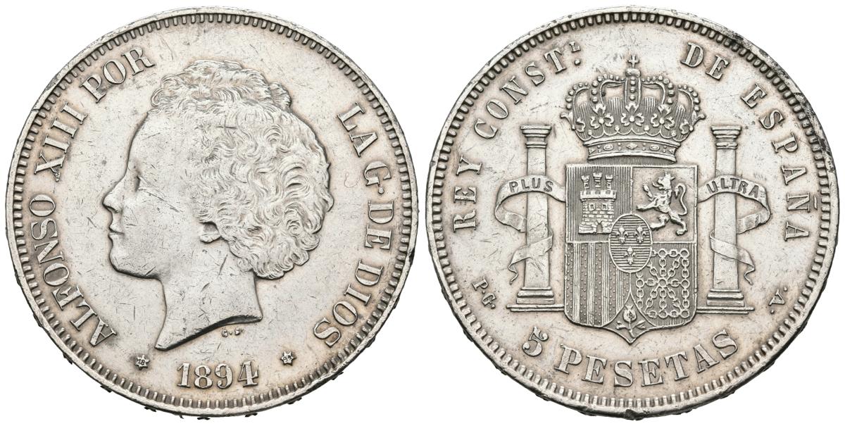 ALFONSO XIII (1885-1931). 5 Pesetas. (Ar. 24.93g / 37mm). 1894 * 18-94. Madrid PGV. (Cal-2019-104). VF.