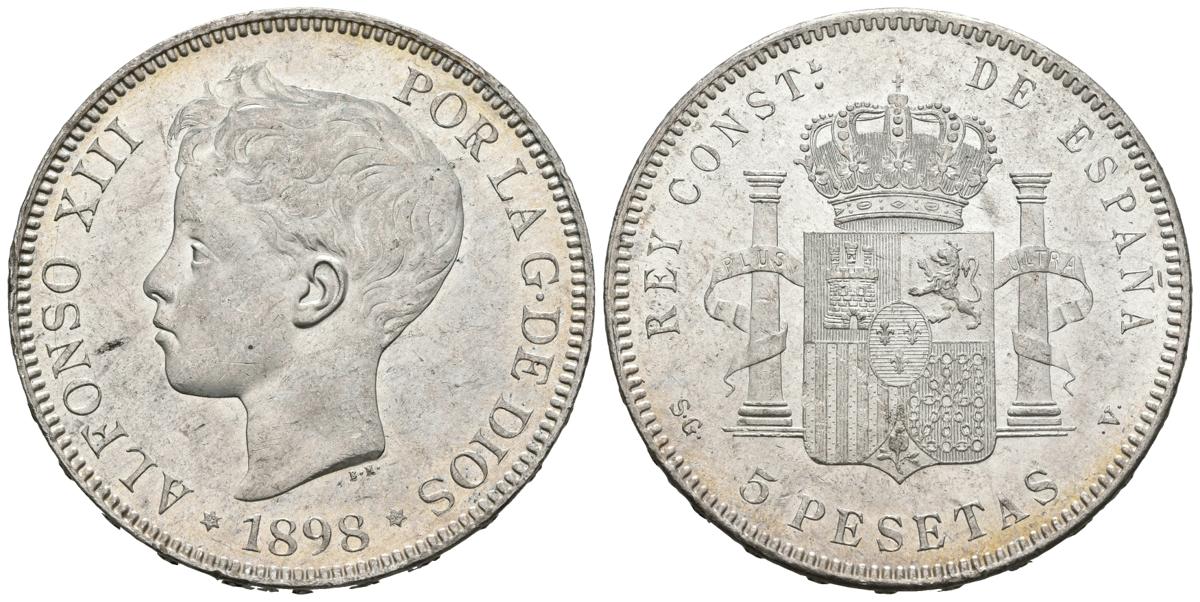 ALFONSO XIII (1885-1931). 5 Pesetas. (Ar. 24.97g / 37mm). 1898 * 18-98. Madrid SGV. (Cal-2019-109). AU. Marquitas.