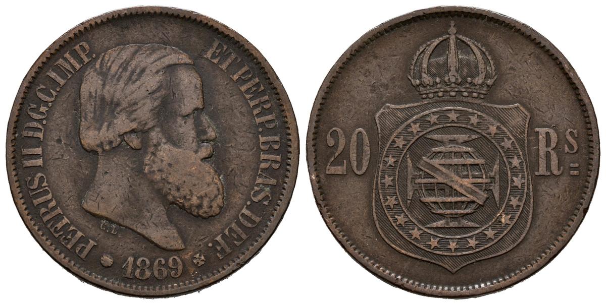 BRAZIL. 20 Reais (Cu. 6.99g / 30mm). 1869 (Reign of Pedro II). (Km # 474). F.