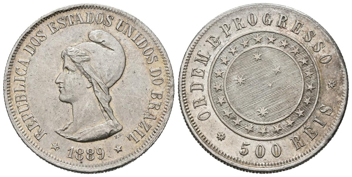 BRAZIL. 500 Reis (Ar. 6.29g / 25mm). 1889. (Km # 494). XF.