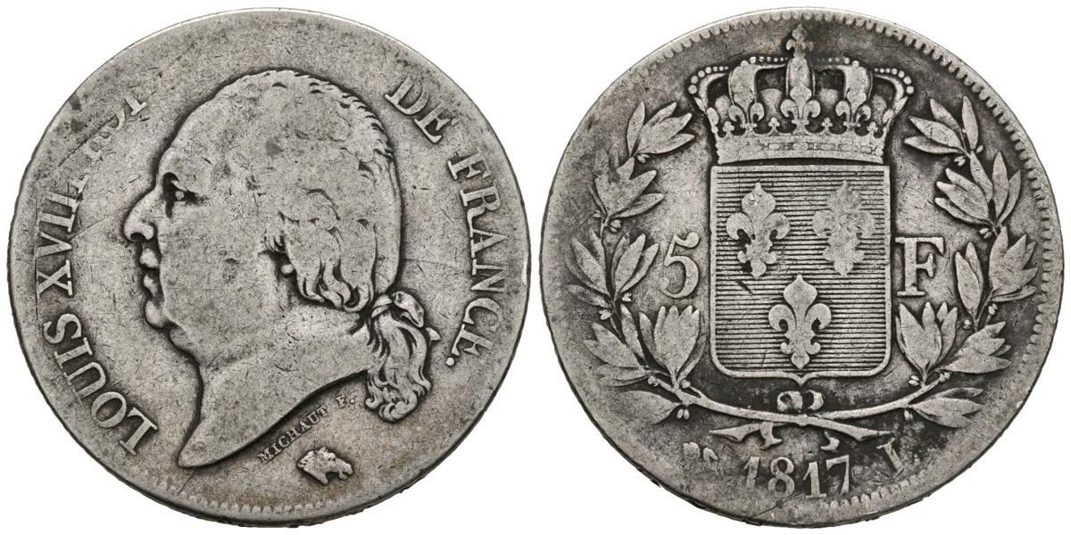 FRANCE. 5 Francs. (Ar. 24.37g / 37mm). 1817. Bayona L. (Km # 711.8). VG.