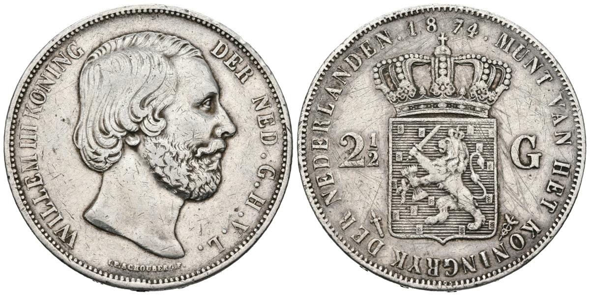 HOLLAND. 2 1/2 Gulden. (Ar. 24.86g / 38mm). 1874. (Km # 82). VF/ F. Stripes on reverse.