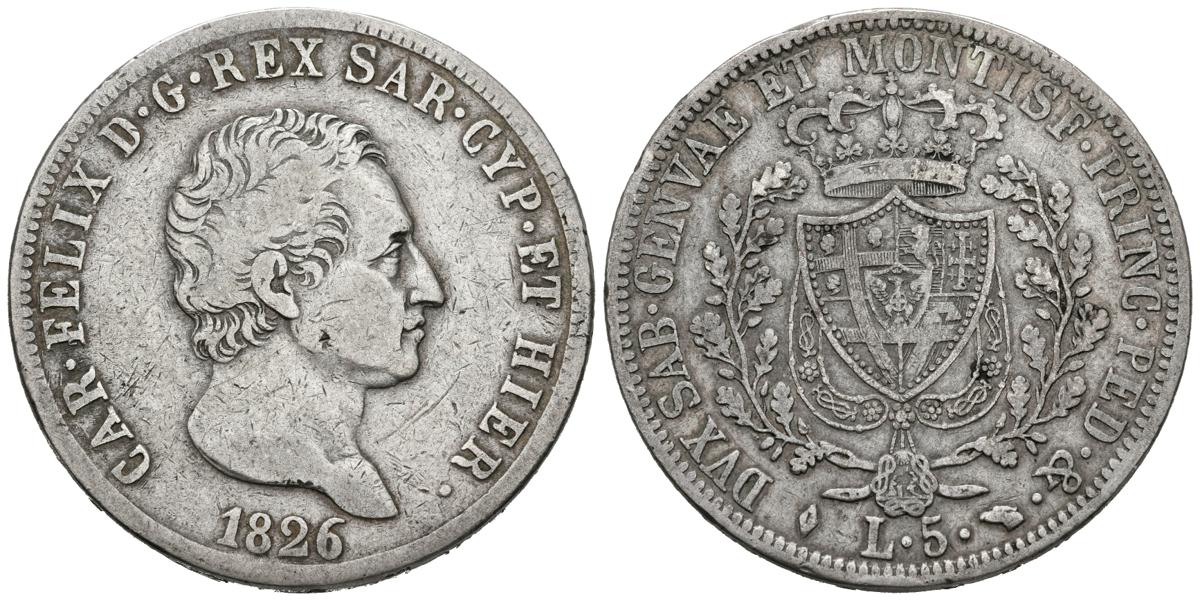 ITALY. 5 liras. (Ar. 24.53g / 37mm). 1826. Sardinia L. (Km # 116.1). VG.