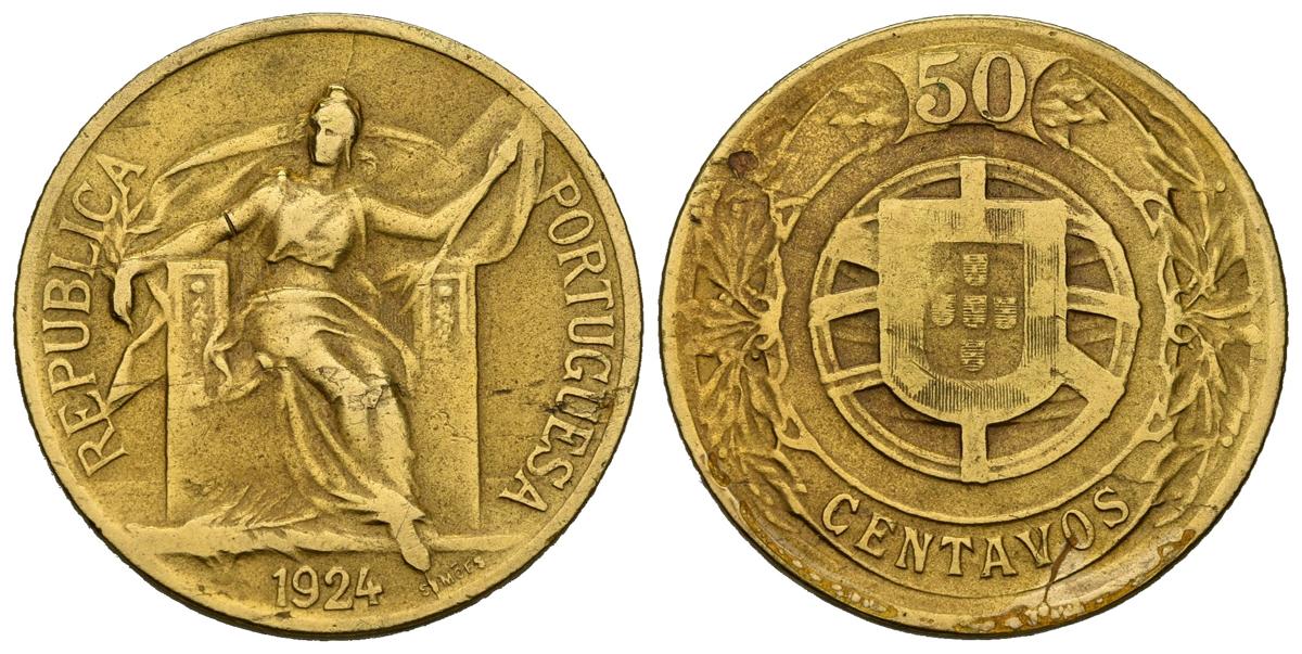 English PORTUGAL. 50 cents. (Al-Ae. 3.96g / 23mm). 1924. (Km # 575). VF/ F. Limited.