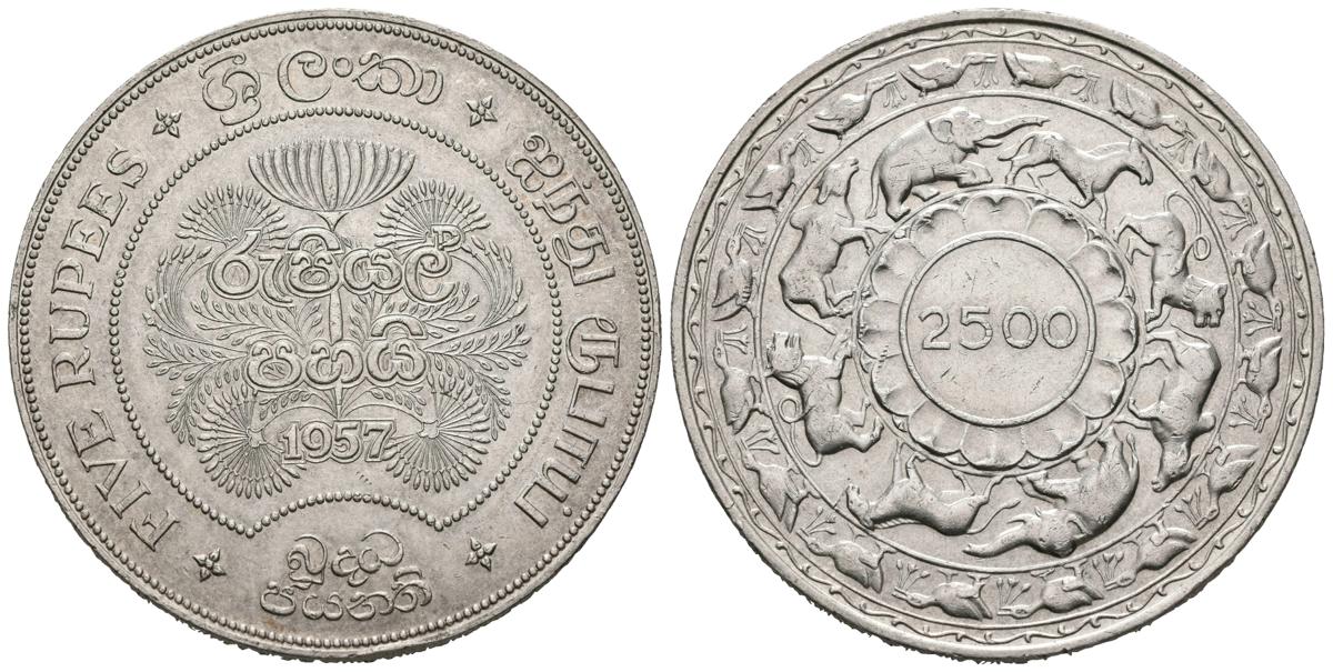 English SRI-LANKA. 5 Rupees (Ar. 28.23g / 39mm). 1957. Celián. (Km # 126). XF.