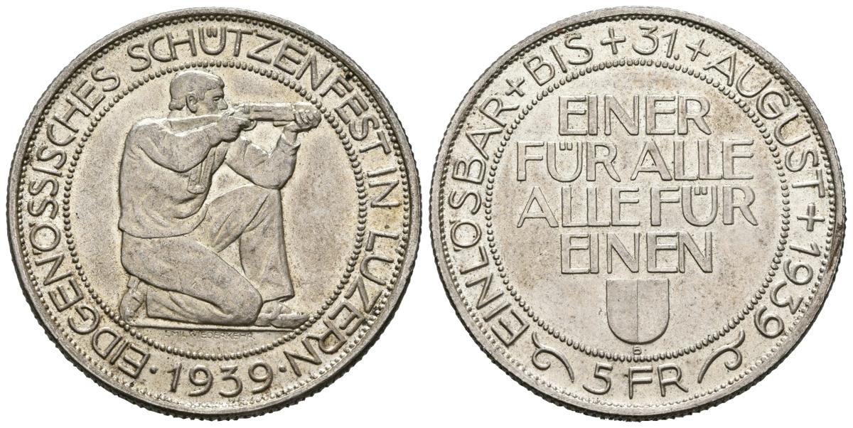 SWITZERLAND. 5 Francs. (Ar. 19.31g / 33mm). 1939. Bern. (Km # S20). XF.