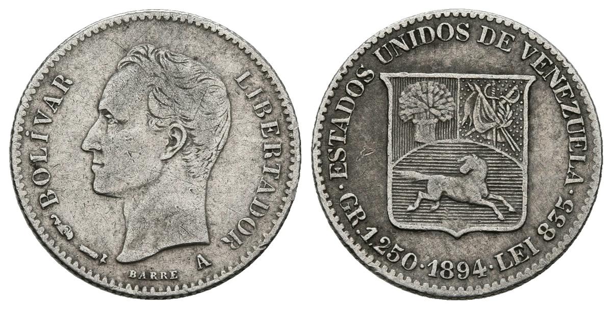 UNITED STATES OF VENEZUELA. 1/4 Bolívar (Ar. 1,23g / 14mm). 1894. Paris. (Km # Y20). VF.