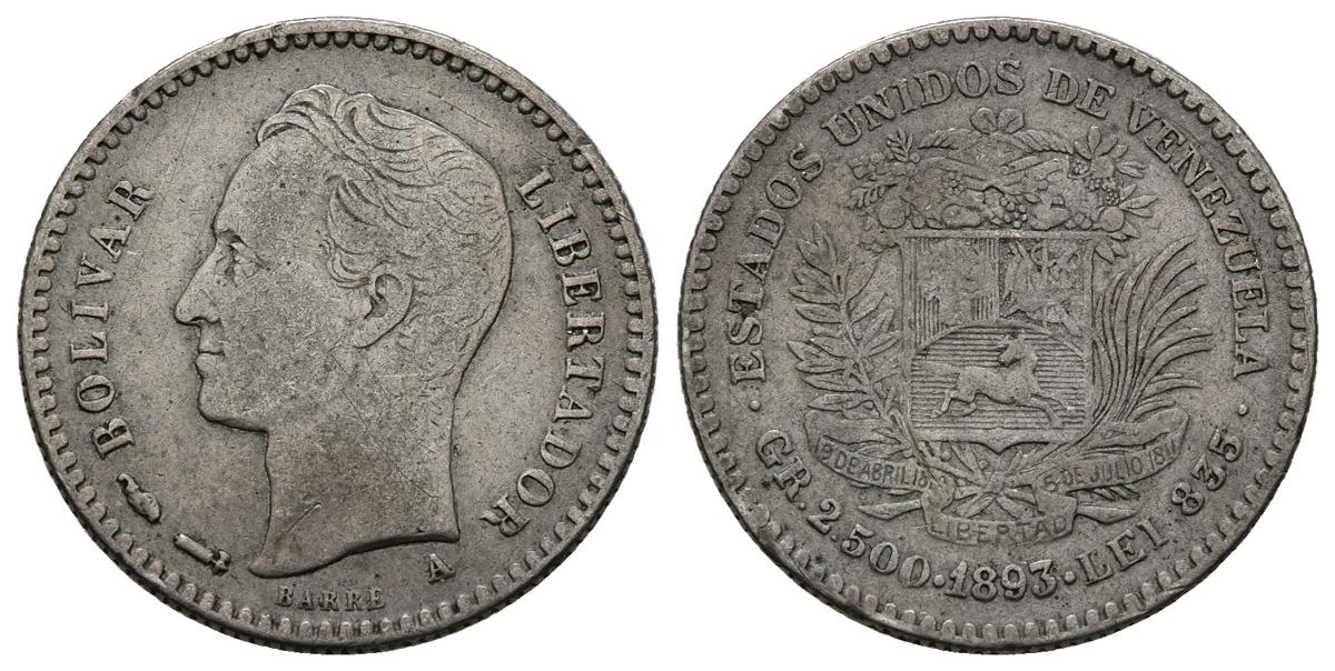 UNITED STATES OF VENEZUELA. 1/2 Bolívar. (Ar. 2.48g / 18mm). 1893. Paris. (Km # Y21). VG.