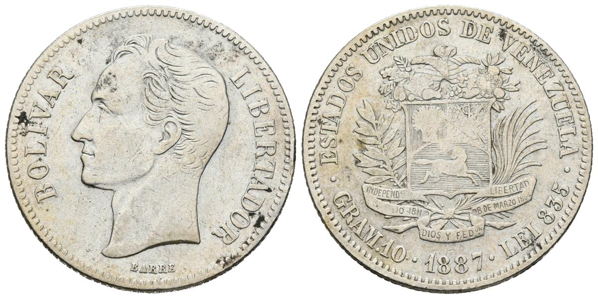 UNITED STATES OF VENEZUELA. 2 Bolivars. (Ar. 10.00g / 27mm). 1887. Caracas. (Km # Y23). VF.