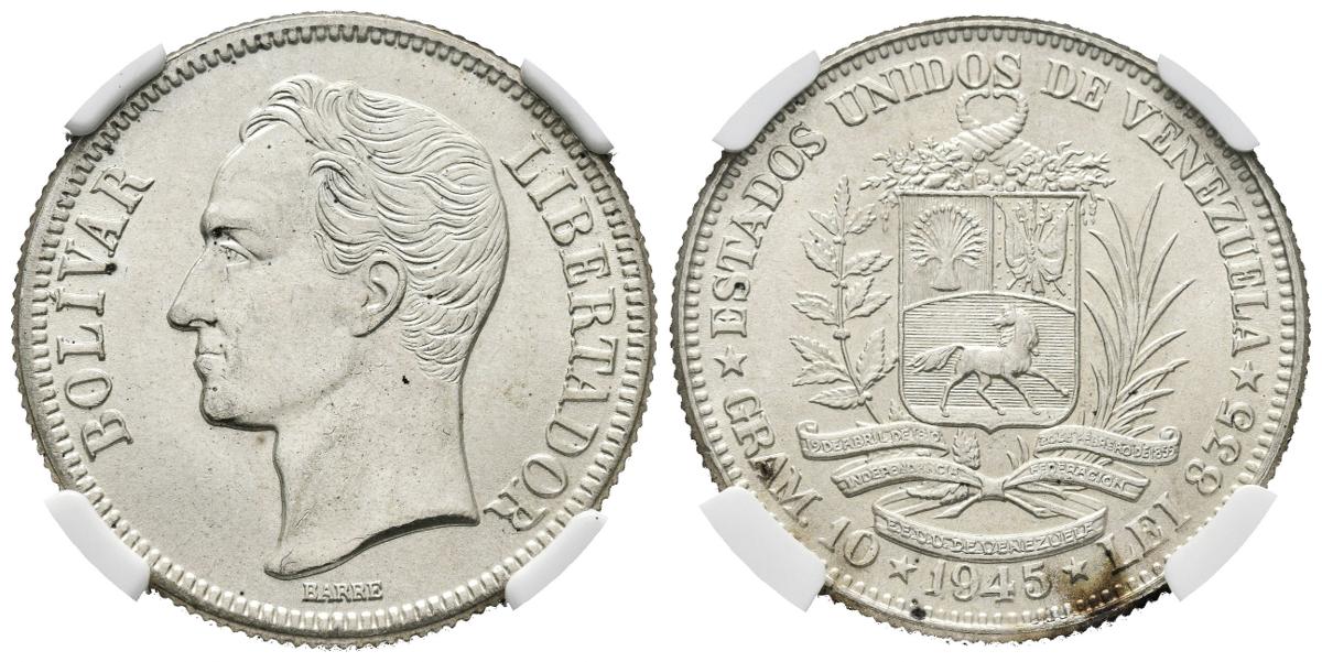 UNITED STATES OF VENEZUELA. 2 Bolívares (Ar. 10.00g / 27mm). 1945. Philadelphia. (Km # Y23a). NGC MS-64 package.