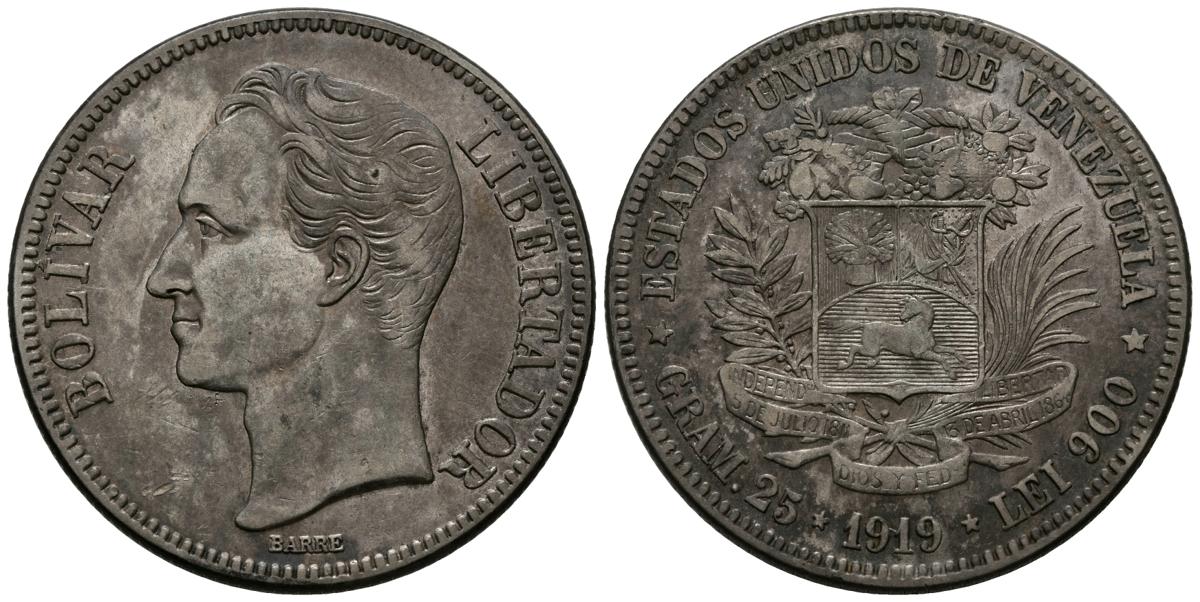 UNITED STATES OF VENEZUELA. 5 Bolivars. (Ar. 24.84 / 37mm). 1919. Philadelphia. (Km # Y24.2). F.
