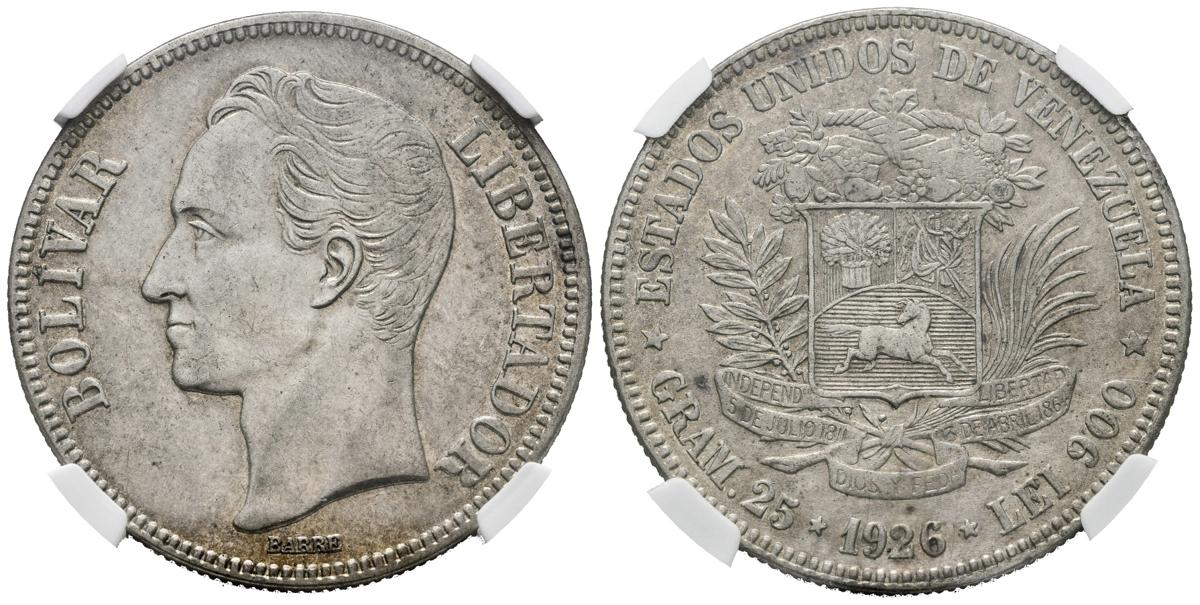 English UNITED STATES OF VENEZUELA. 5 Bolivars. (Ar. 25.00g / 37mm). 1926. Philadelphia. (Km # Y24.2). Encapsulated NGC AU Details. Scratch.
