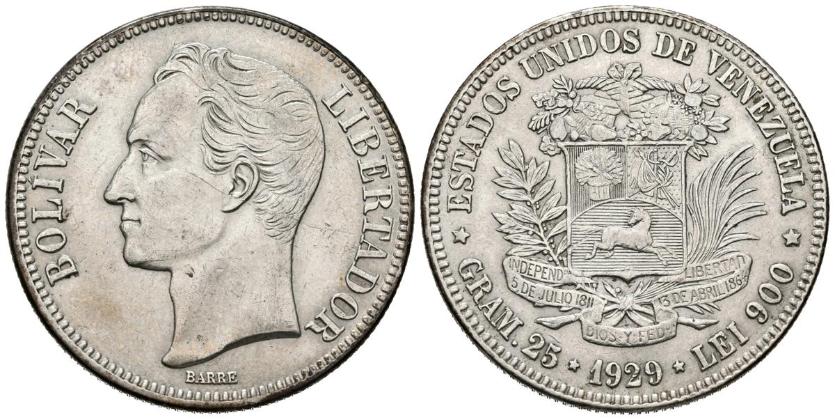UNITED STATES OF VENEZUELA. 5 Bolivars. (Ar. 25.00mm / 37mm). 1929. Philadelphia. (Km # Y24.2). 29 of the date slightly rotated. VF. Nice patina.