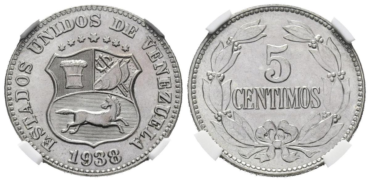 English UNITED STATES OF VENEZUELA. 5 cents. (CuNi. 2.30g / 19mm). 1938. Philadelphia. (Km # Y27). NGC MS-66 package. Precise reddish tone.