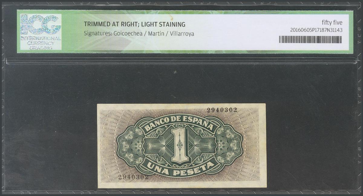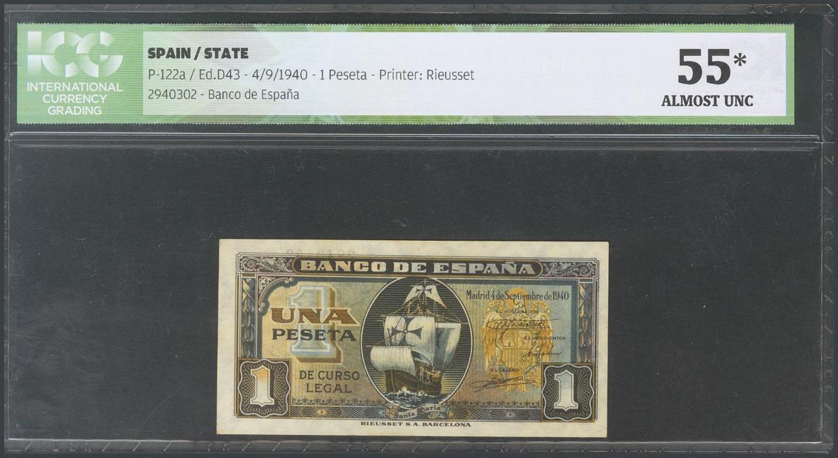 1 peseta. September 4, 1940. Without series. (Edifil 2017: 442). Encapsulated ICG55 (very slightly lowered and invisible point). AU.
