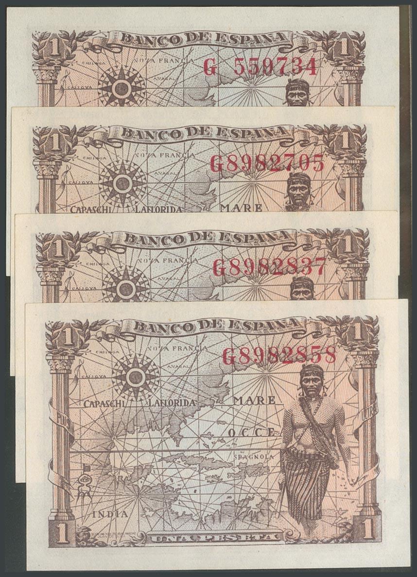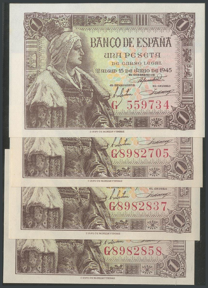 English Set of 4 correlative 1 Peseta banknotes issued on June 15, 1945 of the G series (Edifil 2017: 448a), all of them with original sizing. UNC.