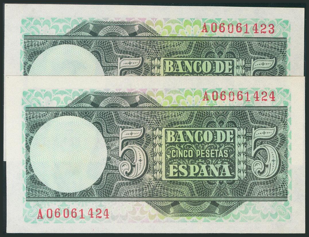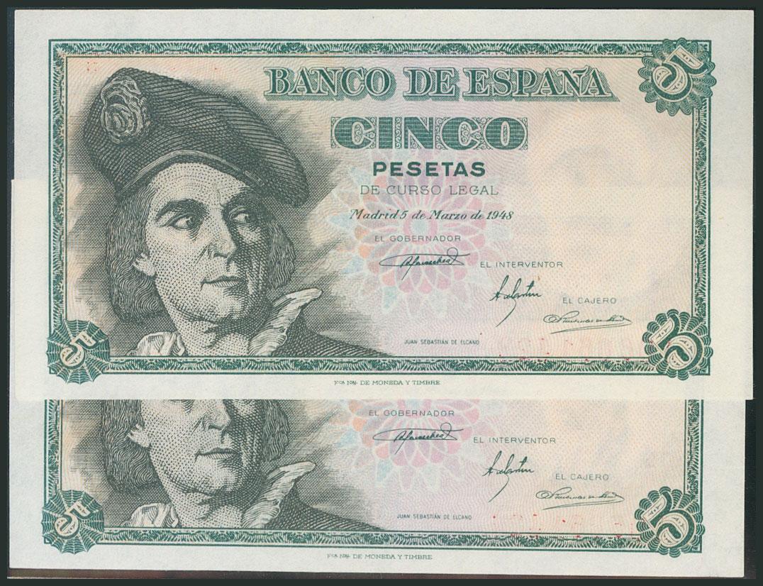 5 Pesetas. March 5, 1948. Correlative pair. Series A. (Edifil 2017: 455a). UNC.