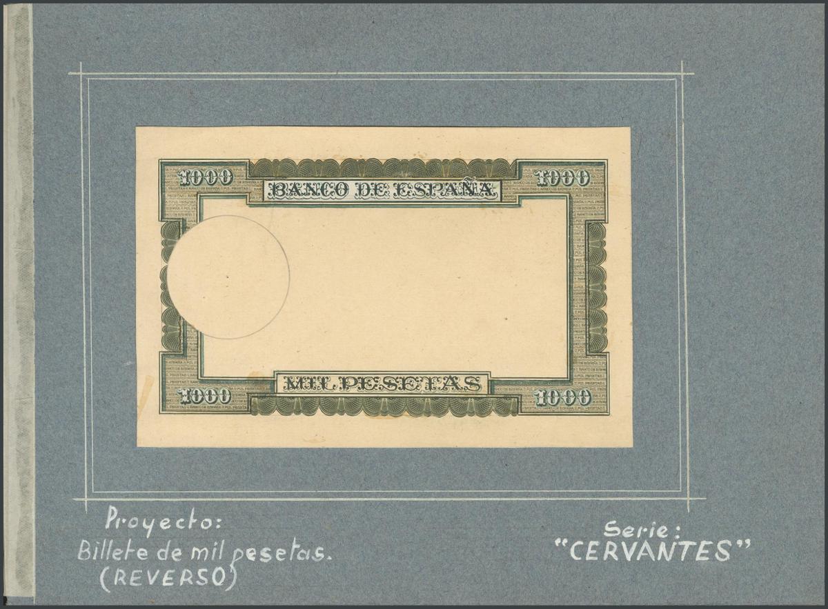 "Series: Cervantes" is mentioned, perhaps in reference to a sketch of 25 pesetas dated July 7, 1952 with which it shares the rectilinear style of the borders and placards with the name of the Bank of Spain. However, what is certain is that it is a design that, with minimal modifications (the micro-printed texts in the corners under the denominations were replaced by fruit ornaments), was used, as Don Ramón Cobo Huici indicates, on the reverse of the 1,000 pesetas banknote of 1951. This banknote began to be manufactured in 1953, which would allow the date of this project to be set at the end of the 1940s or perhaps in 1951 or 1952 as part of the development of the banknote dedicated to Sorolla, which makes it a very interesting example to complement this period.