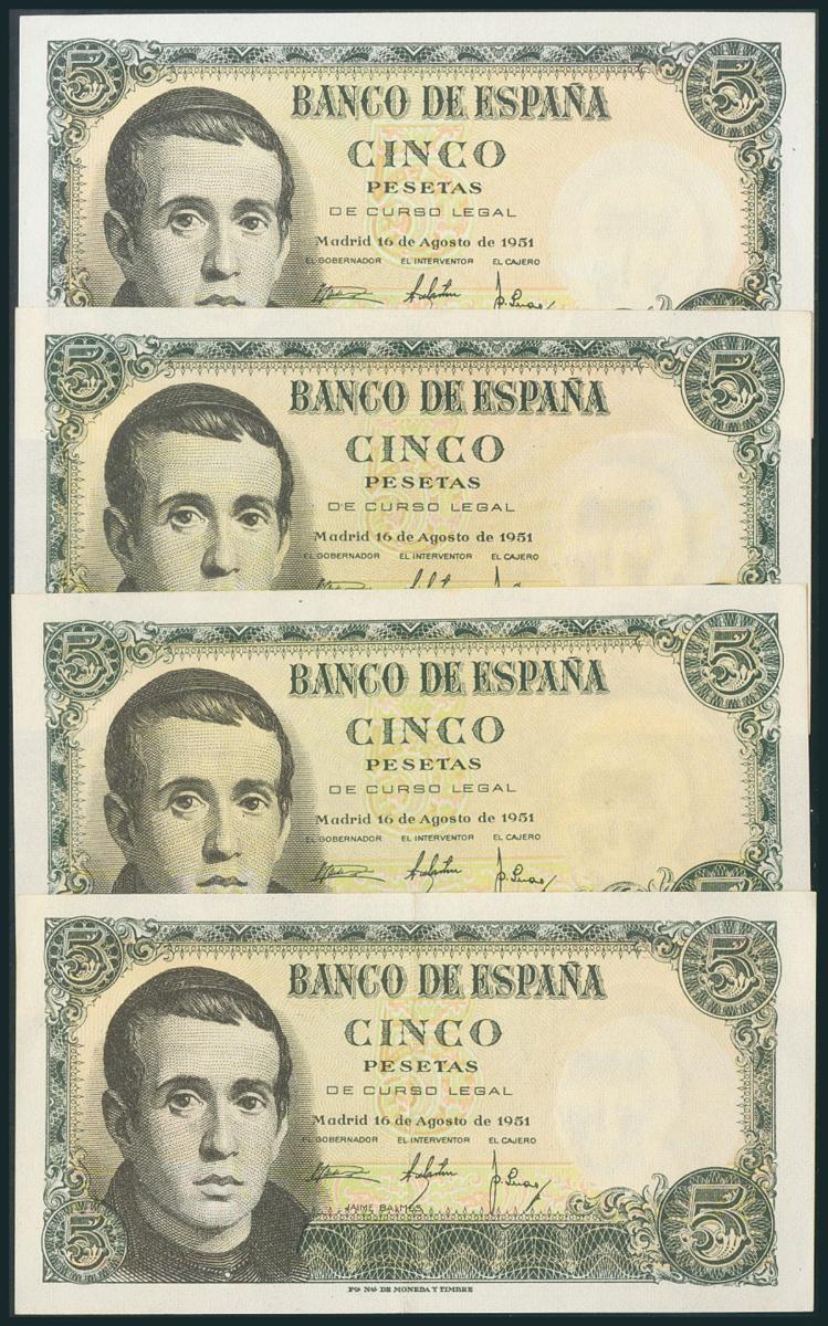 Set of 4 banknotes of 5 Pesetas issued on August 16, 1951 with series T, V, 1C and 1L (Edifil 2017: 459a). UNC/ XF.