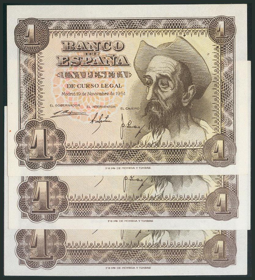 English Set of 3 1 Peseta banknotes, issued on November 19, 1951 with series D, F and P, respectively, series D with staple mark (Edifil 2017: 461a). UNC/ F.