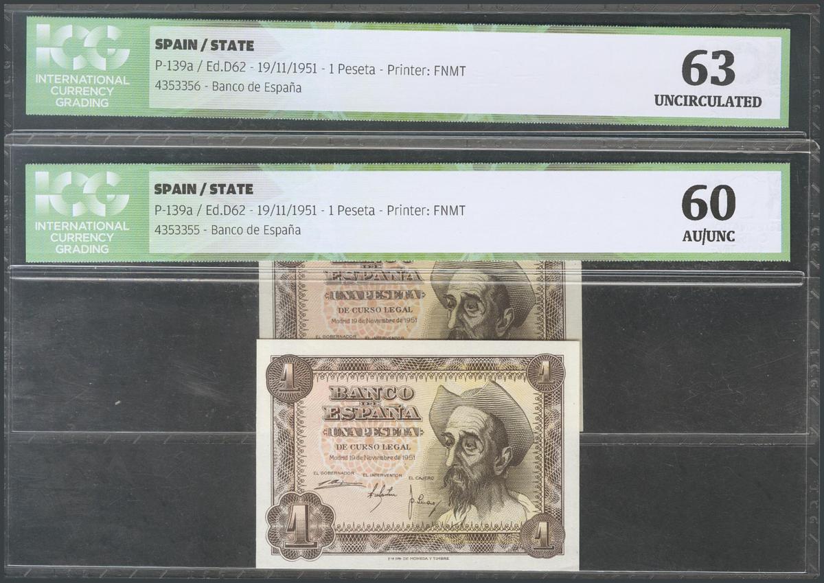 1 peseta. November 19, 1951. Correlative couple. No serie. (Edifil 2017: 461). Encapsulated ICG63 and 60, respectively. UNC/ UNC.