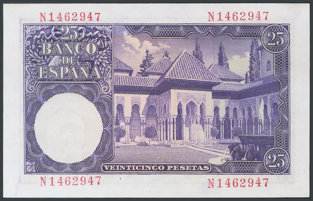25 Pesetas. July 22, 1953. Series N, last series issued. (Edifil 2017: 467a). Original sizing. UNC.