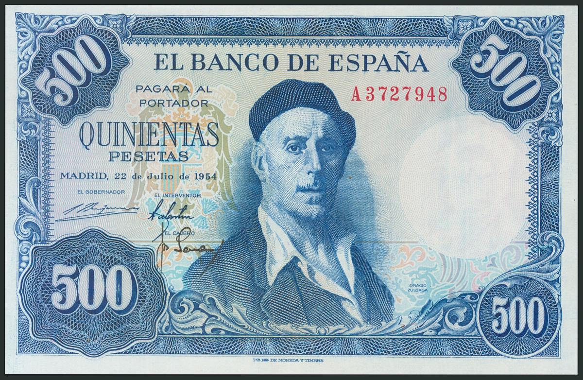 500 pesetas. July 22, 1954. Series A. (Edifil 2017: 468a). Invisible vertical fold, preserving its size. AU.