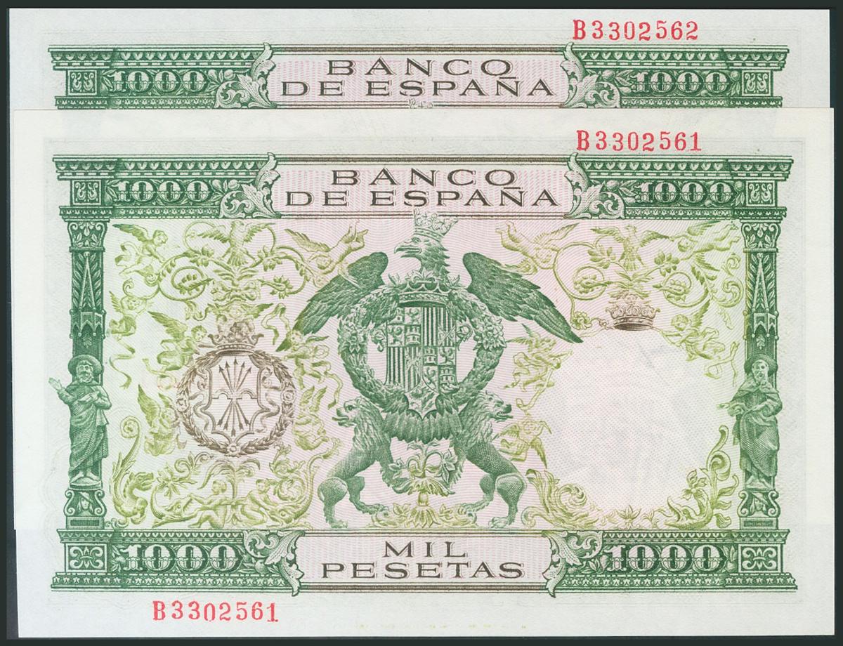 1000 Pesetas. November 29, 1957. Correlative pair. Series B. (Edifil 2017: 469b). Original sizing. UNC.