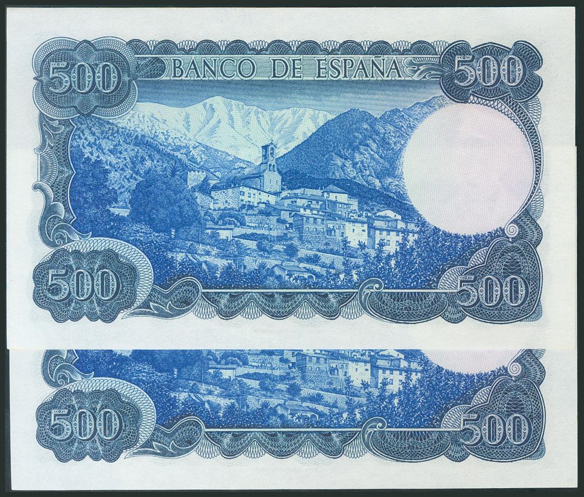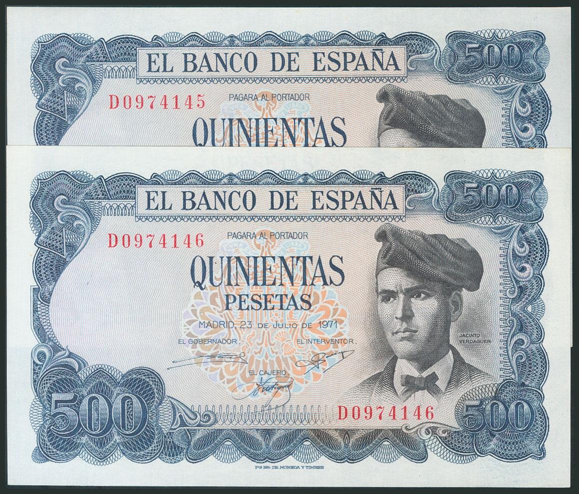 500 pesetas. July 23, 1971. Correlative couple. Series D. (Edifil 2017: 473a). UNC.