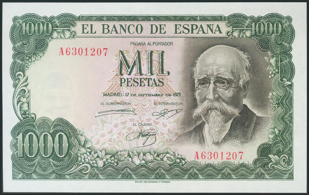 English 1000 Pesetas. September 17, 1971. Series A. (Edifil 2017: 474a). UNC.