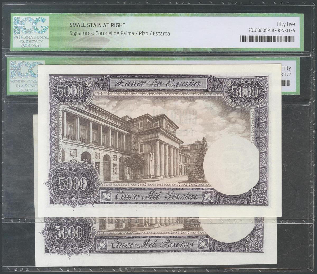 5000 Pesetas. February 6, 1976. Correlative pair. No serie. (Edifil 2017: 475). Encapsulated ICG55 and 50, respectively (very light spots on the right margin on both banknotes). AU/ F.