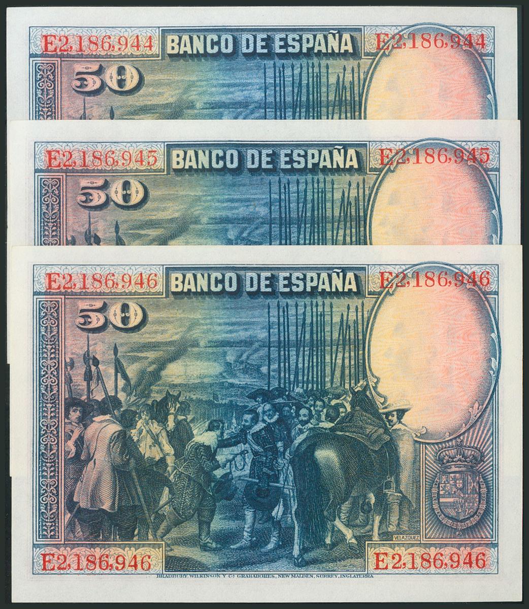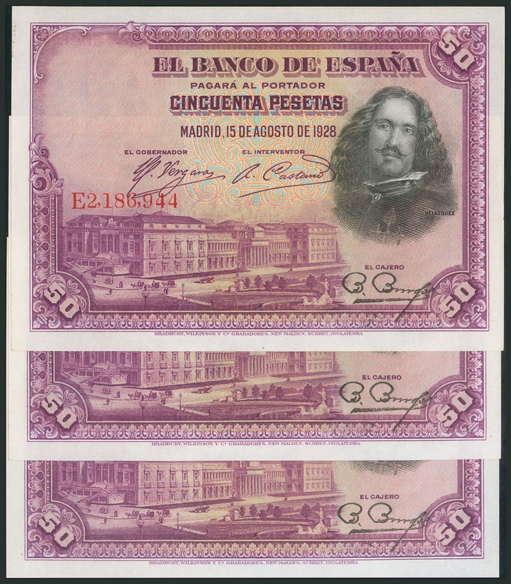 50 Pesetas. August 15, 1928. Correlative trio. Series E. (Edifil 2017: 354). It keeps all its original size. UNC.