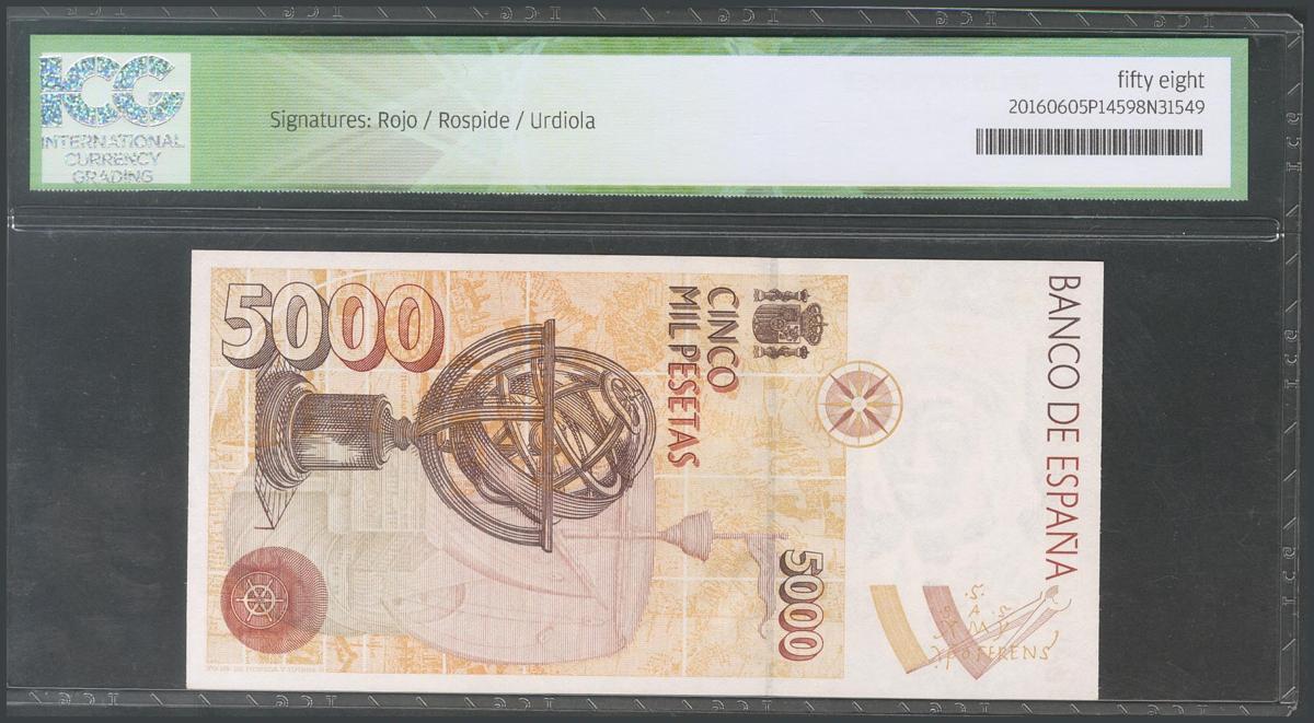 5000 Pesetas. October 12, 1992. Without series. (Edifil 2017: 484). Encapsulated ICG58. AU.