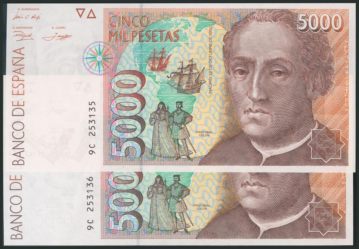 5000 Pesetas. October 12, 1992. Correlative couple. 9C special series. (Edifil 2017: 484b). UNC.
