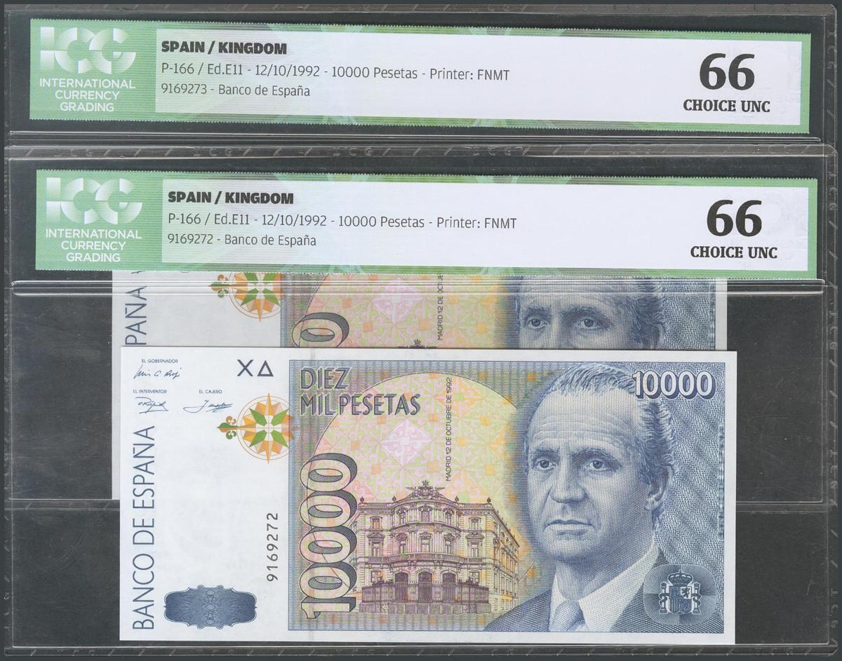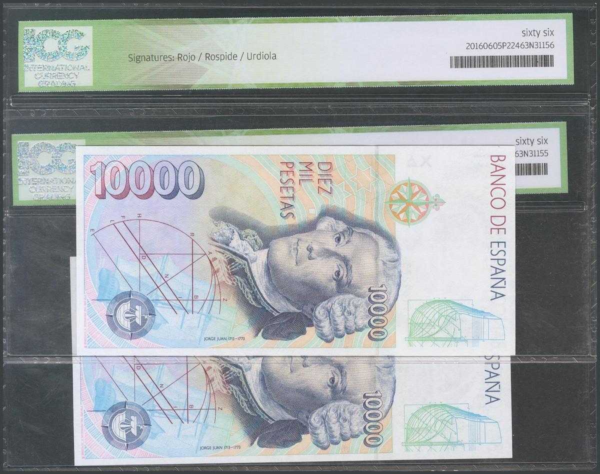 10000 Pesetas. October 12, 1992. Correlative couple. No serie. (Edifil 2017: 485). Encapsulated ICG66, both. UNC.