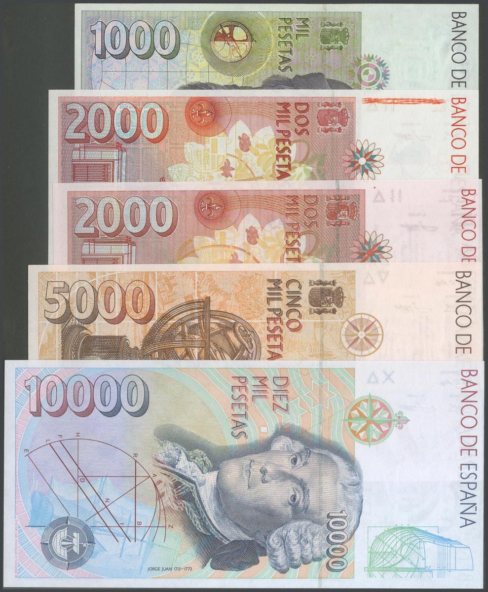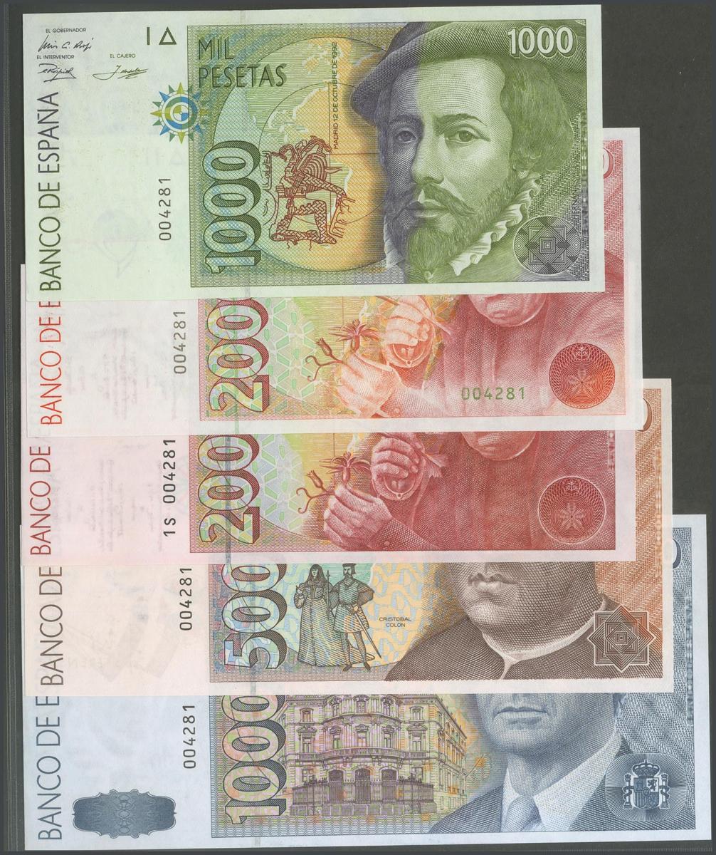 English Complete series of 5 banknotes of the 1992 issue (including the 2000 Pesetas of 1995 with the 1S series). Without series and all of them with the same numbering. (Edifil 2017: 482/85, 482A). UNC.