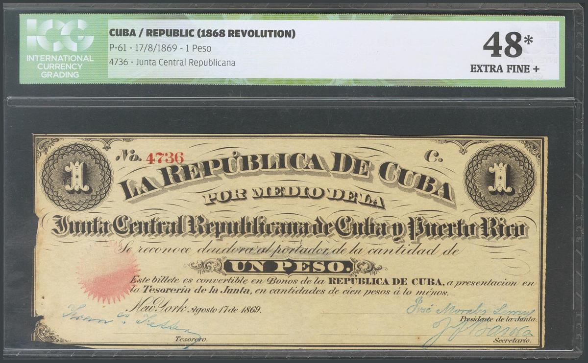 REPUBLIC OF CUBA 1869. 1 Peso. August 17, 1869. Series C. (Edifil 2017: 35). Package ICG48. VF.