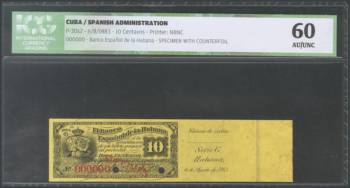 CUBA. 10 cents. August 6, 1883. Series G. Specimen, number 000000 and with matrix on the right. (Edifil 2017: 46, Echenagusía: 31b). Very rare. ICG60 package. UNC.