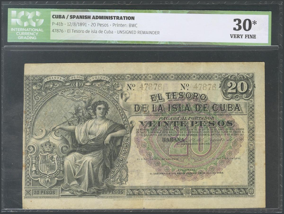 CUBA. 20 pesos. August 12, 1891. (Edifil 2017: 65, Echenagusía: 37). Encapsulated ICG30 (small repair in the central pligue). F.