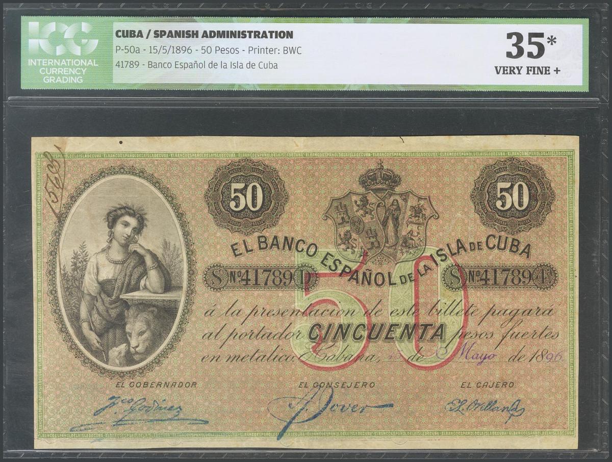 CUBA. 50 pesos. August 15, 1896. (Edifil 2017: 74, Echenagusía: 51). Encapsulated ICG35 (slight erosion). F.