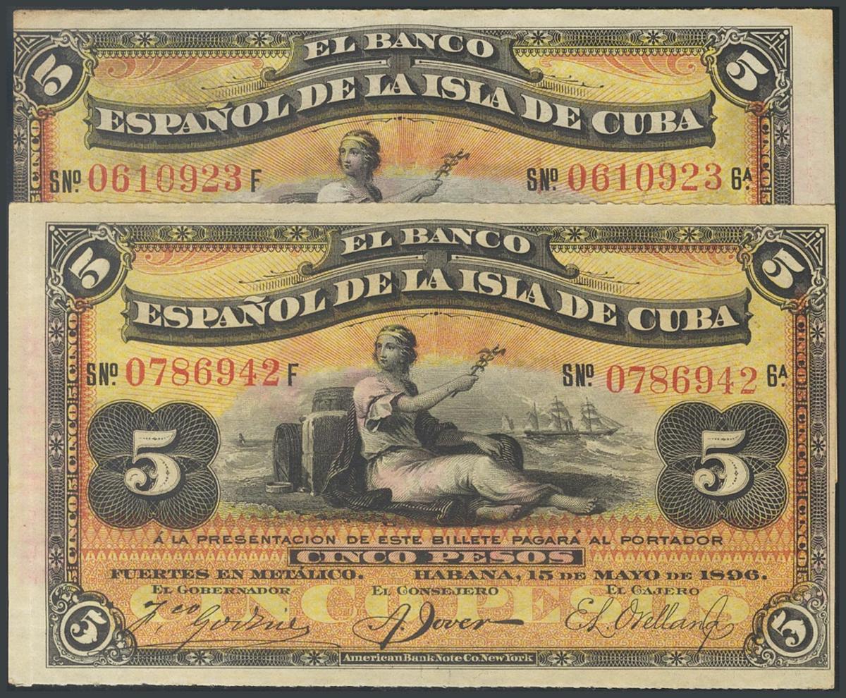 English CUBA. Set of 2 banknotes of 5 Pesos issued on May 15, 1896 with the PLATA surcharge. (Edifil 2017: 81, Echenagusía: 48). VF.