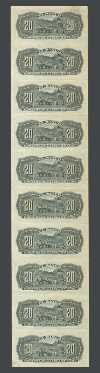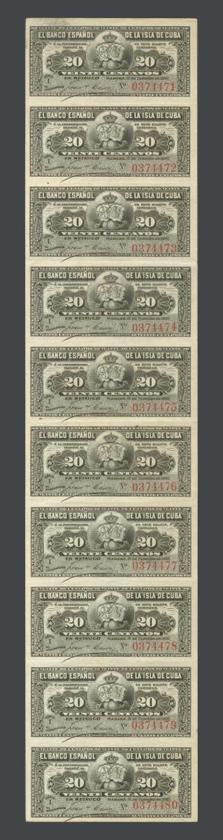 English CUBA. 20 cents. February 15, 1897. Series I. (Edifil 2017: 85). Complete sheet of 10 bills. Unusual UNC/ UNC.