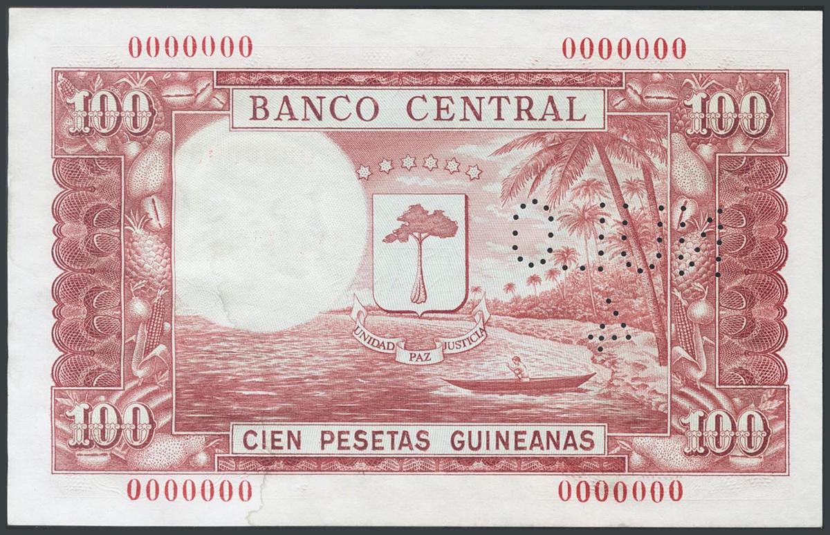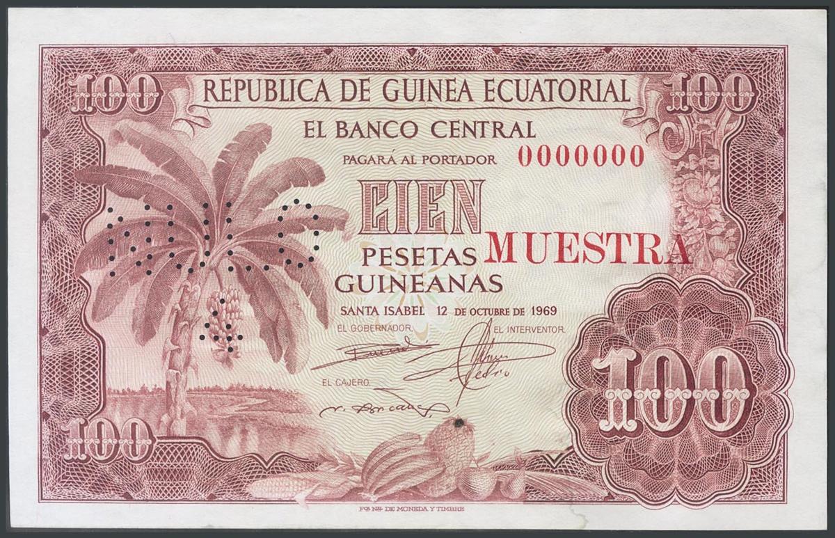REPUBLIC OF EQUATORIAL GUINEA. 100 Guinean Pesetas. October 12, 1969. SAMPLE and numbering 0000000. (Pick: 1). Very rare, original sizing. UNC.