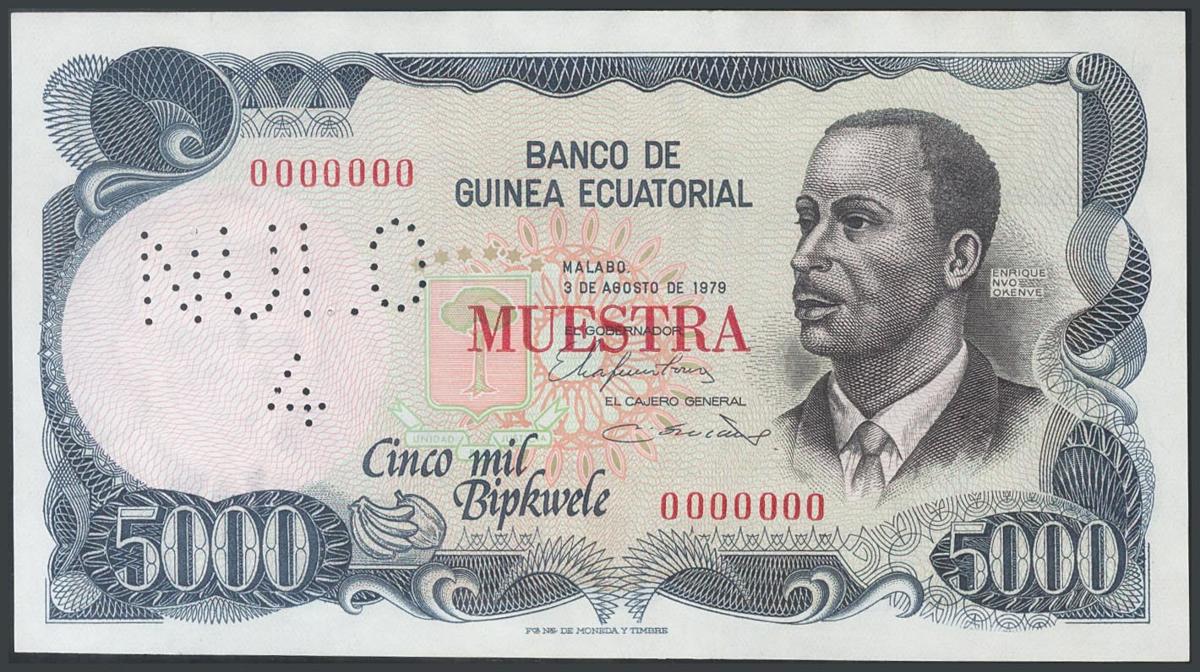 English EQUATORIAL GUINEA. 5000 Bipkwele. August 3, 1979. SAMPLE and numbering 0000000. (Pick: 17). Very rare and original sizing. UNC.
