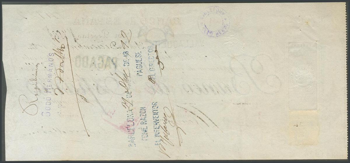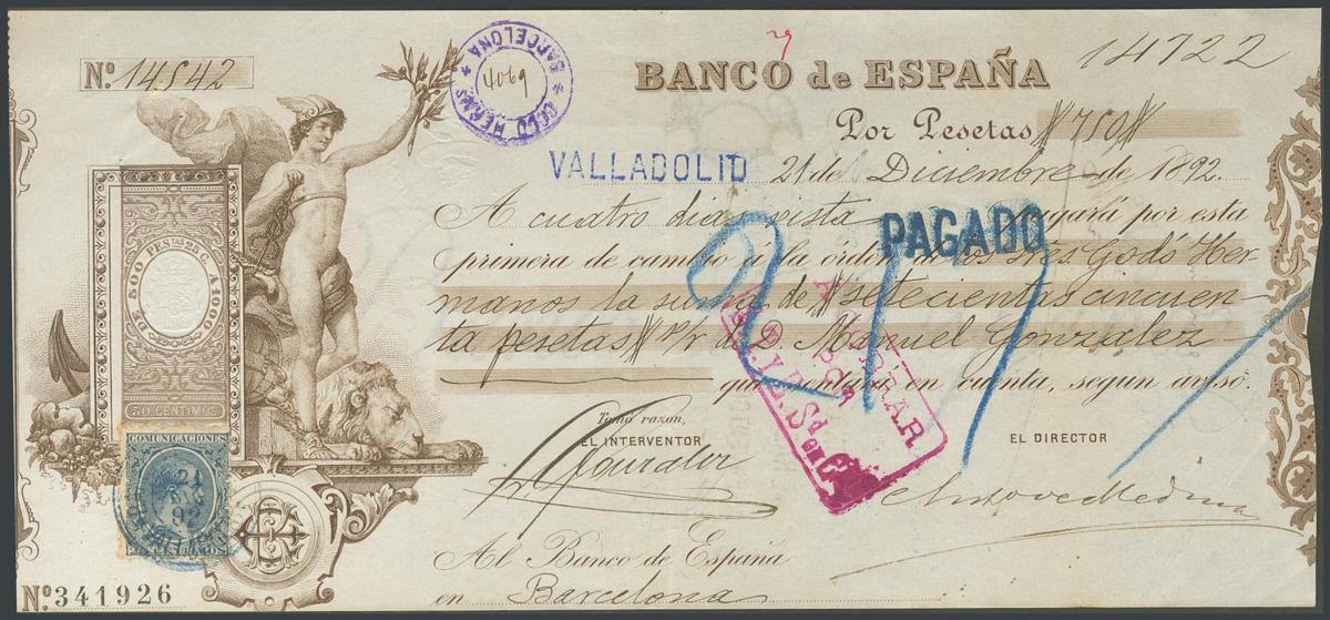 First Exchange of the Bank of Spain, dated in Valladolid in 1892. Unusual. VF