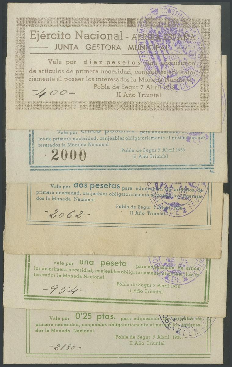 POBLA DE SEGUR (LERIDA). 25 Cents, 1 Peseta, 2 Pesetas, 5 Pesetas and 10 Pesetas. April 7, 1937. (González: 5930, 5932, 5933, 5934, 5935). UNC/ AU.