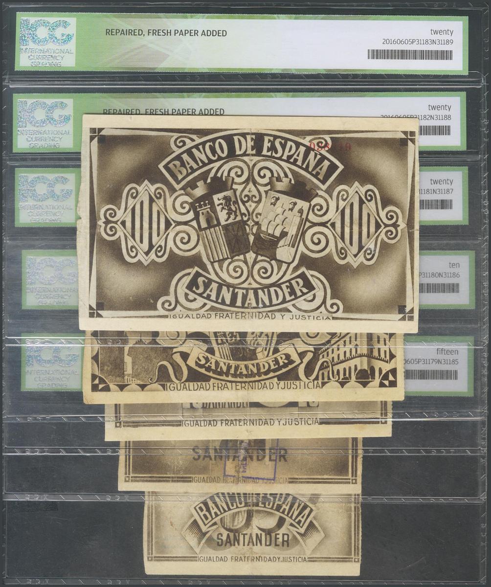 Set of 5 Bank of Spain banknotes issued at the Santander branch corresponding to the values of 5 Pesetas, 10 Pesetas, 25 Pesetas, 50 Pesetas and 100 Pesetas, issued on November 1, 1936. (Edifil 2017: 375/79) . Encapsulated in graduations between ICG10 and 20 (all of them beautifully repaired). VG.
