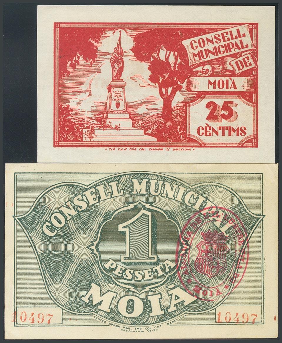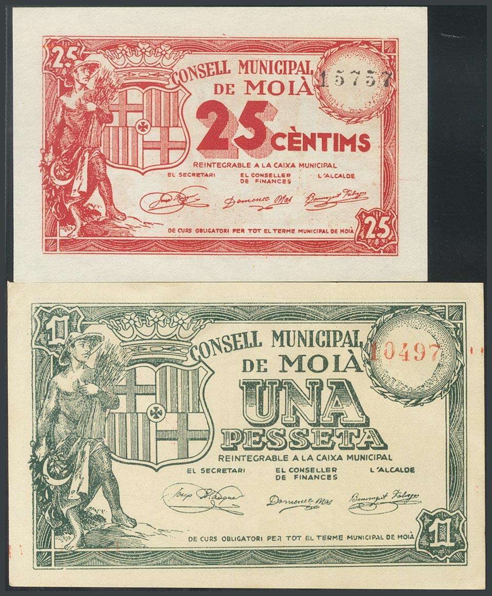 MOIA (BARCELONA). 25 Cents and 1 Peseta. (1938ca). (González: 8689/90). AU.